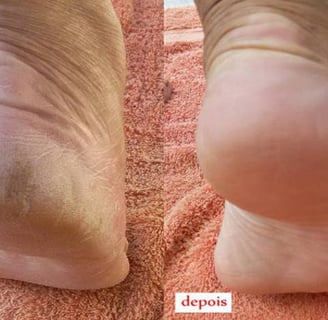 Na foto seguinte foram feitas tres aplicações consecutivas! Dá para ver que a rachadura quase que completo foi embora... e isso EM APENAS UM SÓ DIA...!!! Para melhor resultado, a gente recomenda fazer mais uma aplicação uma ou duas semanas depois, para tirar um eventual resto de células mortas que ainda ficou. Reiterando: Por mais bem feitas as aplicações forem feitas, quanto melhores os resultados!A foto acima mostra um pé com apenas duas aplicações seguidas num só dia. As calosidades e as rachaduras são bem menos acentuadas e no caso uma ou duas aplicações já resolvem o caso.